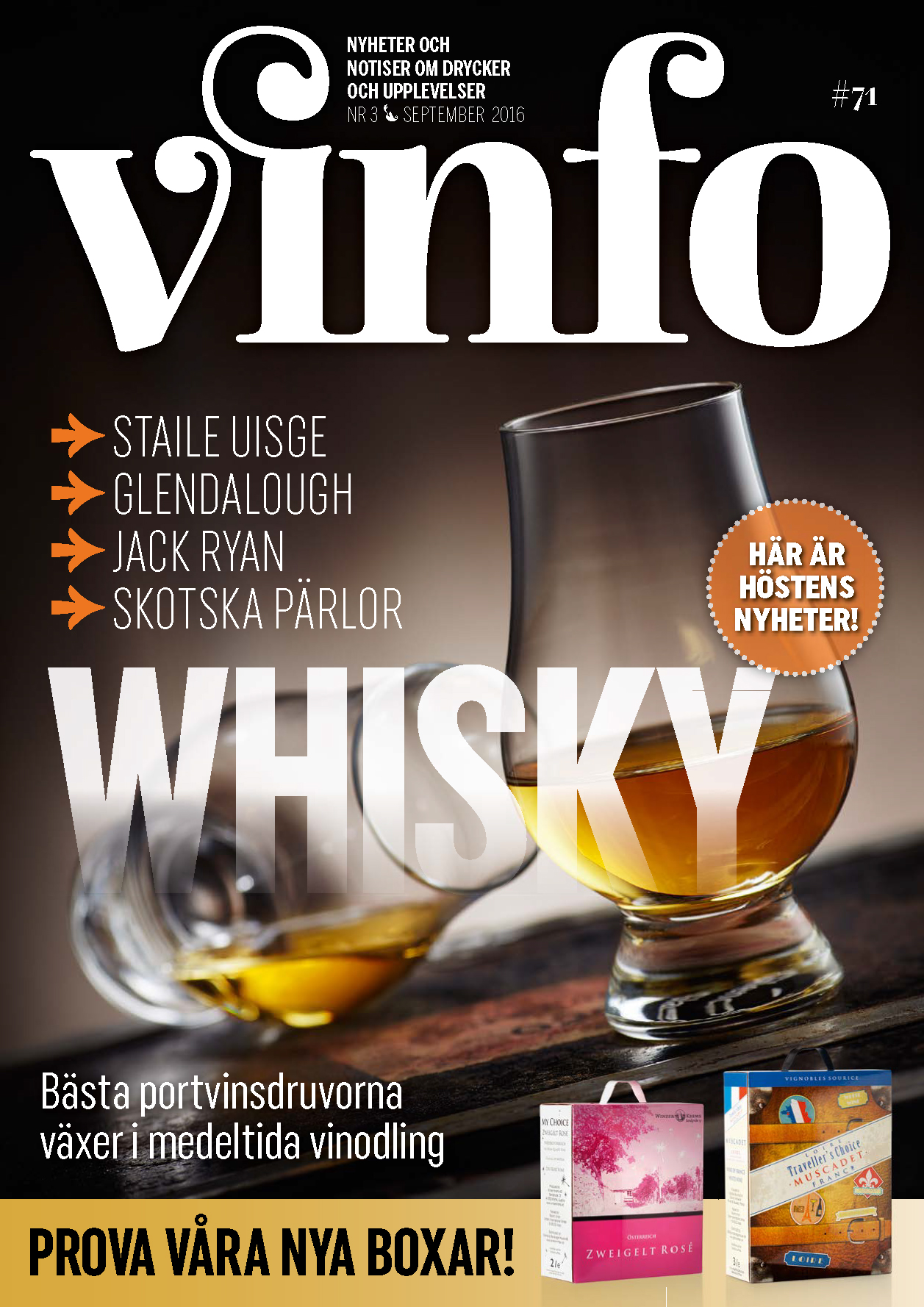Höstens Vinfo nummer 71 bjuder på massor av whisky! Vi får bland annat bekanta oss närmare med våra irländska whiskynyheter. Dessutom har vi den äran att presentera Stale Uisge – en single malt tappad exklusivt för Granqvist! Våra reportage tar oss till Dourodalen och portvinsproducenten C. da Silva. I Barossa Valley lär vi känna familjeägda Schild Estate – en mindre vinproducent med världsrykte. Som vanligt bjuder vi på flera trevliga dryckestips och goda recept som passar den klara, färgsprakande hösten.